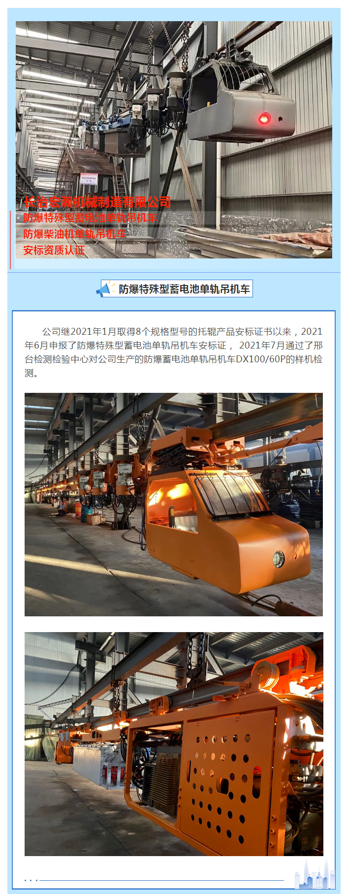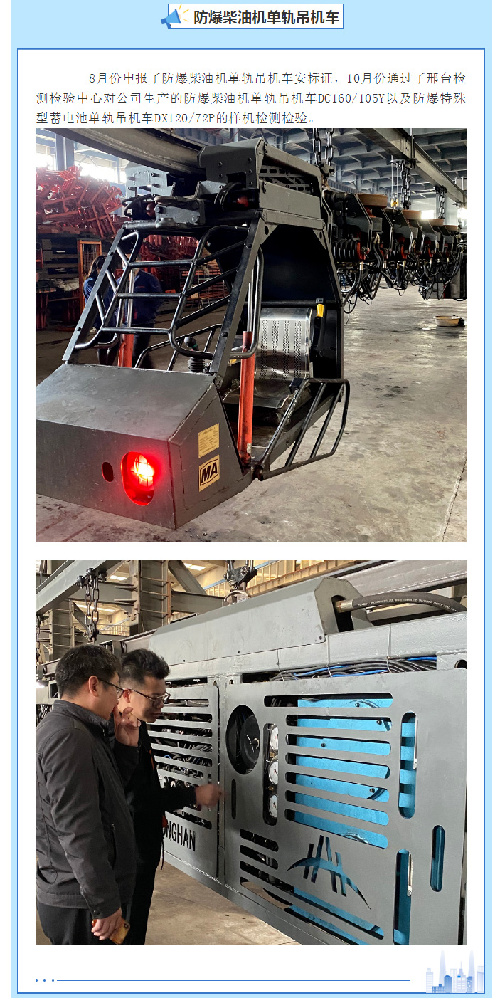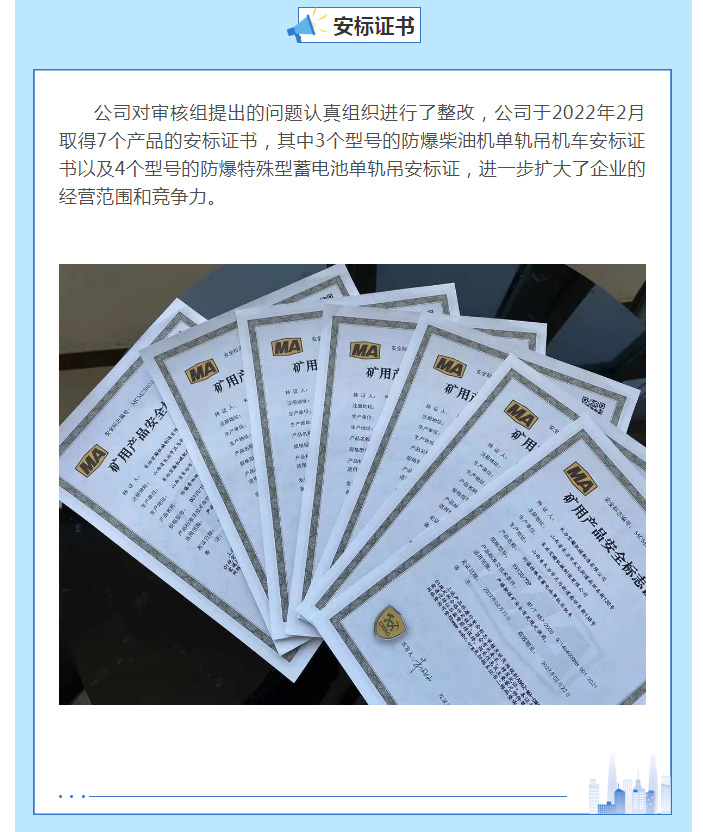 賀:長(zhǎng)治宏瀚機(jī)械有限公司取得7個(gè)單軌吊機(jī)車產(chǎn)品的安標(biāo)證書